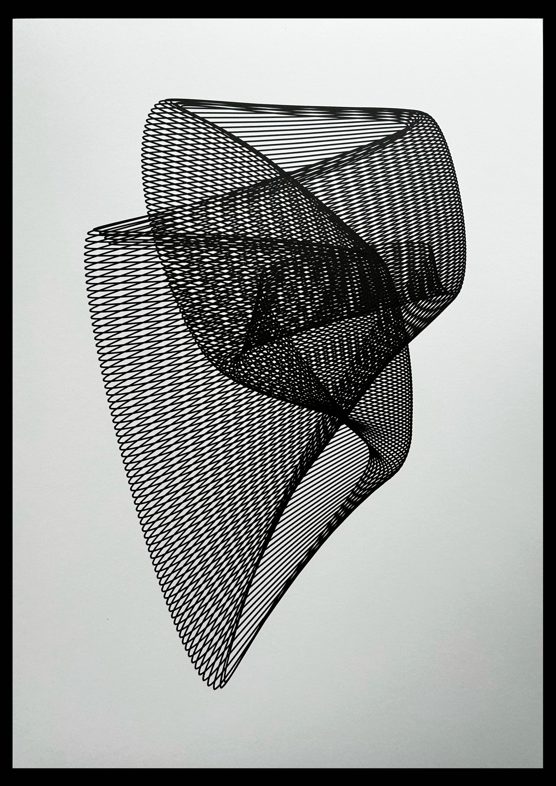 Sculptural form, digital artwork created using an XY plotter. Each piece is individually plotted, making every piece a one-of-a-kind creation with subtle variations.